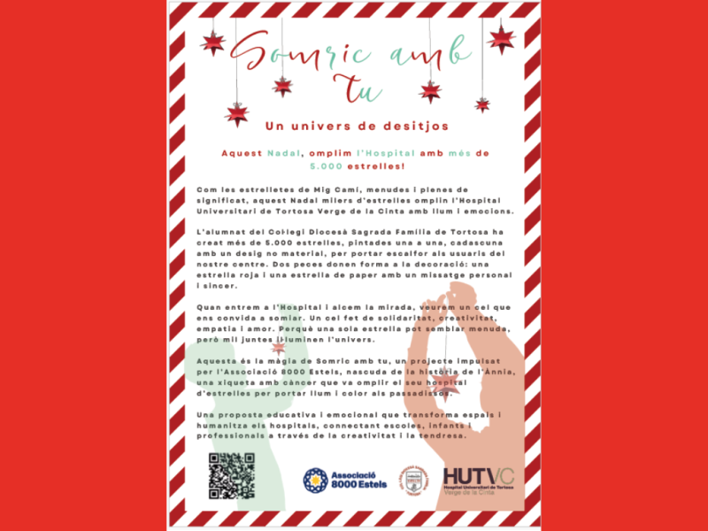 La primera edició de Somric amb tu arriba al Verge de la Cinta convertint-se en un projecte comunitari d’una força excepcional. Més de 1.000 infants, d’I3 a 6è de primària, creen milers d’estrelles plenes de desitjos, missatges i colors que decoren els passadissos de l’hospital.